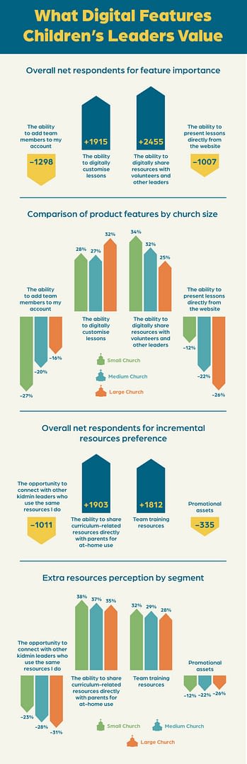 Key Takeaway: Ministry educators have self-identified that they want a curriculum based on God’s Word, to teach kids from Early Childhood (including toddler) to Elementary School ages. The curriculum should be shareable and customizable and help kids discover their identity in God’s Big Story.