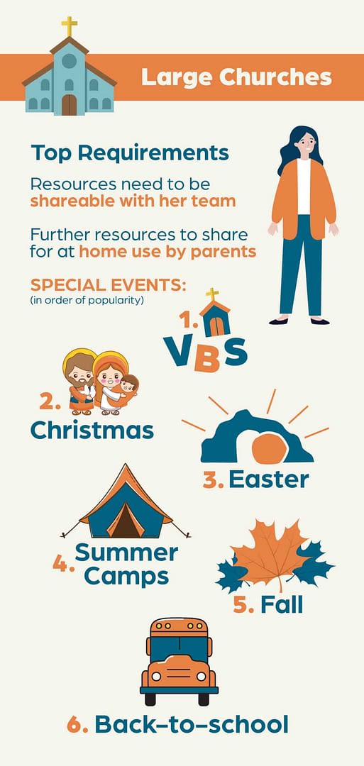 Many large church kidmin leaders use mainly digital children’s ministry resources. They like to customize lessons. Their needs fall into these categories: