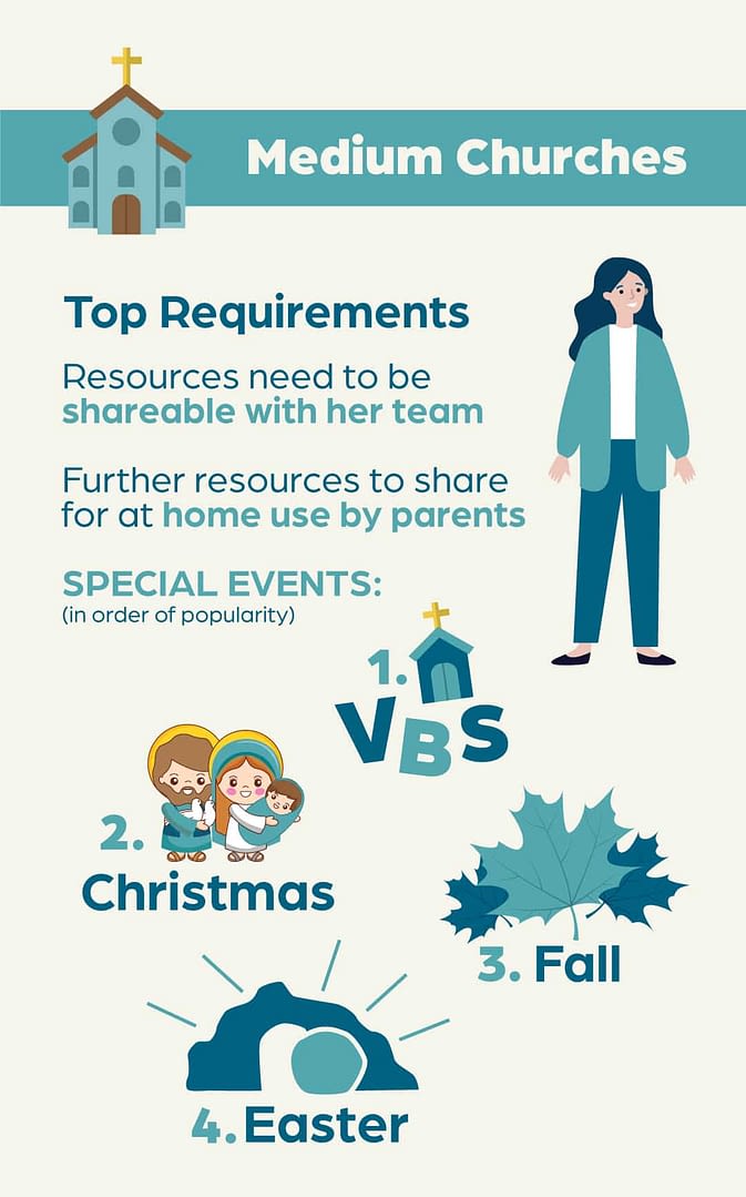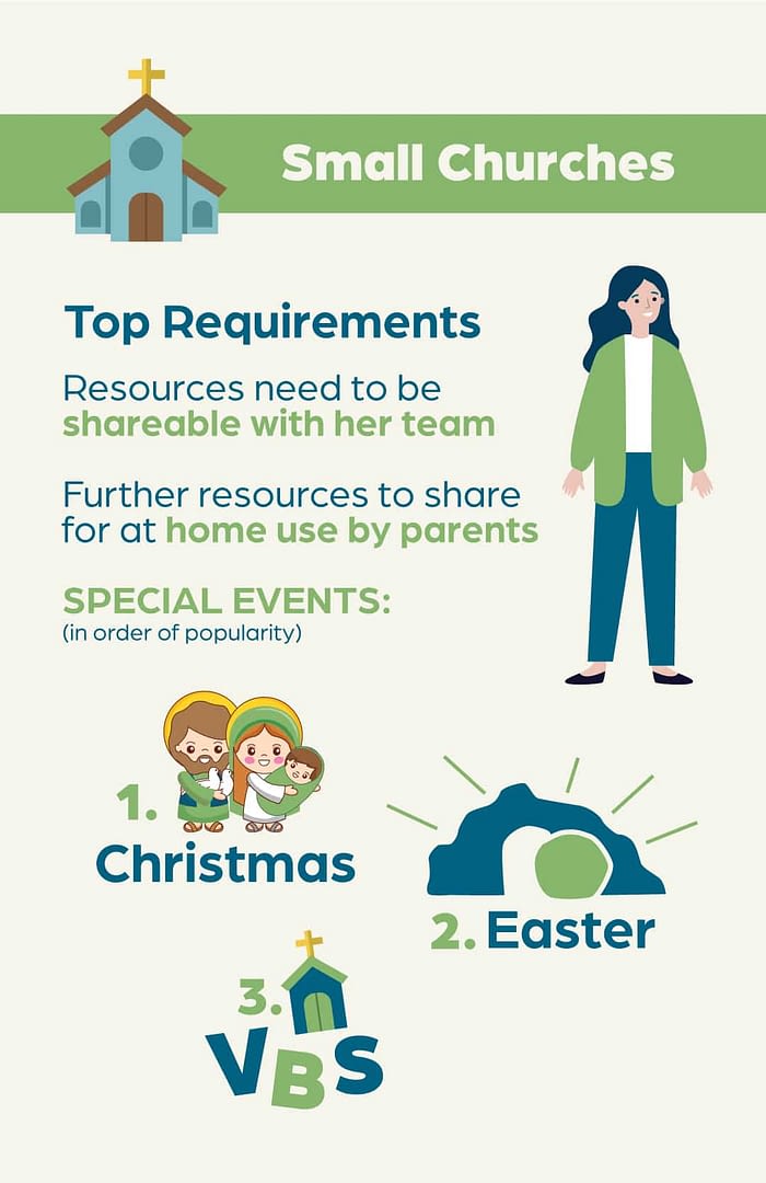Based on survey responses, we created three depictions of children’s ministry leaders: one for smaller churches, one for medium-sized congregations, and one for larger ministry settings. To better understand their needs, we reviewed each persona’s unique kidmin curriculum experiences, viewpoints, preferences, and challenges.