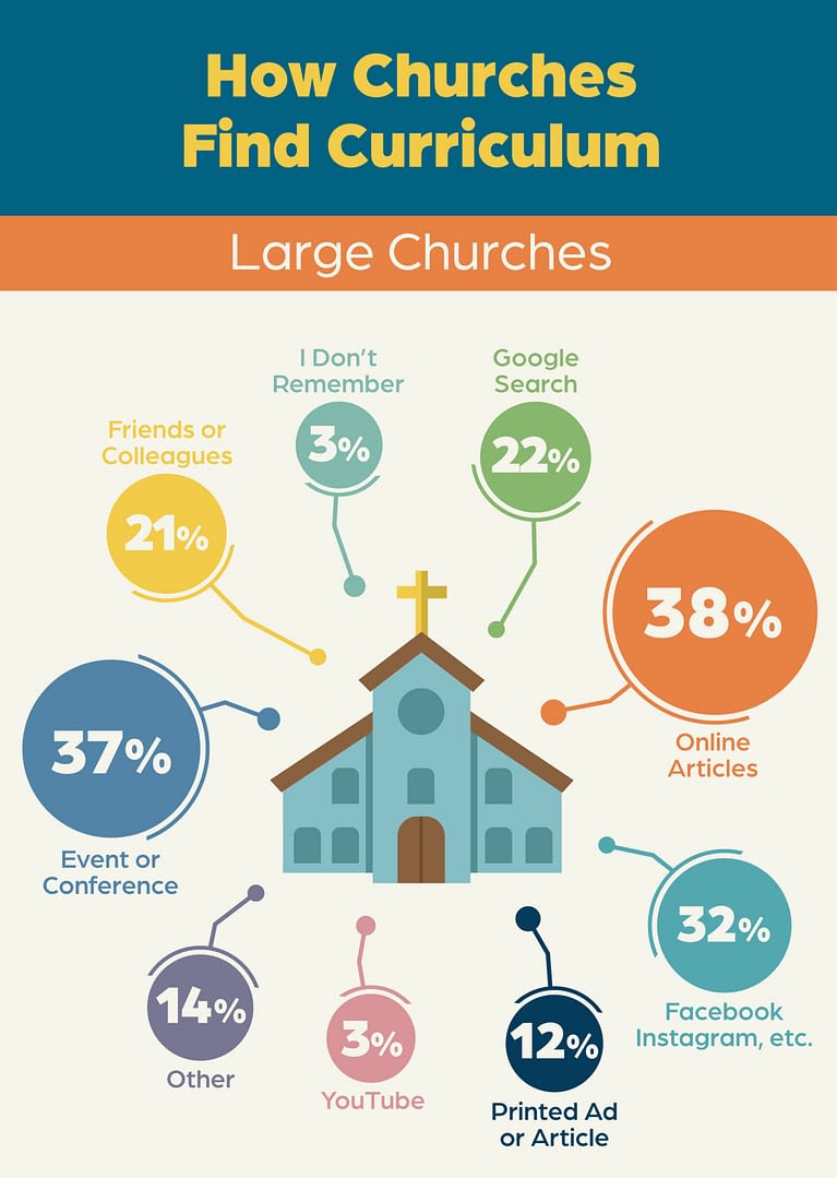 - The large church leader’s top methods to find curriculum are online articles, events and conferences, social media, Google, and friends and colleagues.