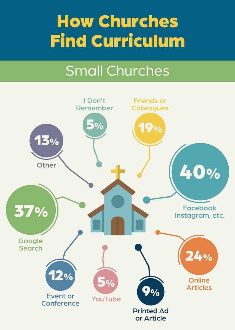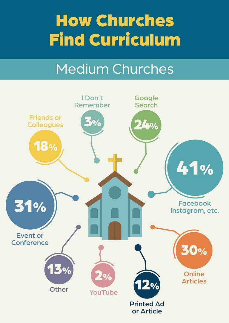 - The medium church leader mainly uses social media, events and conferences, online articles, and Google to find children’s ministry curriculum.