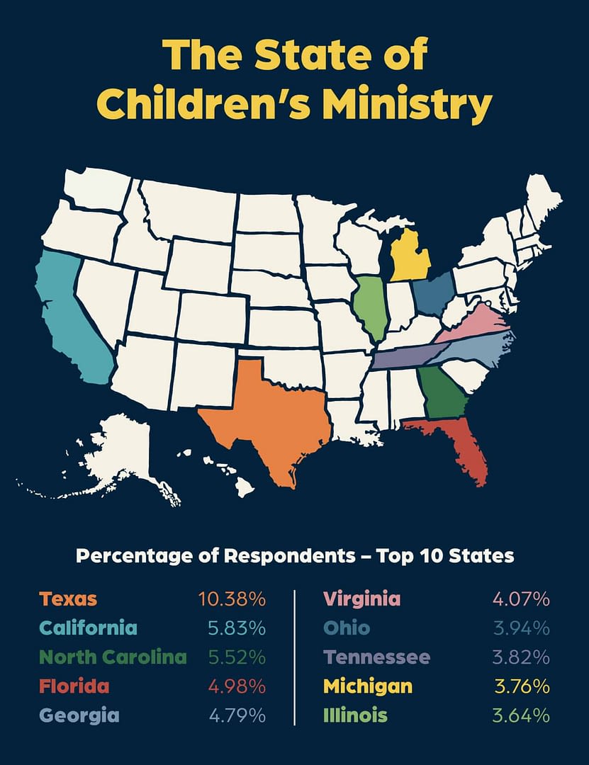 2,182 children’s ministry leaders responded to Wonder Ink’s survey, including subscribers and non-subscribers of Wonder Ink curriculum. The table below shows the top 10 states as a percentage of total U.S. responses.