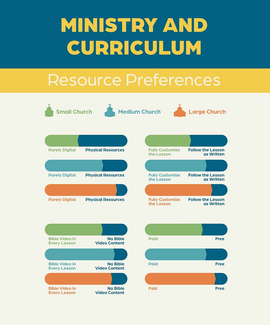 While most churches, regardless of their size, use multiple resources to search for curriculum, there are a few points that are unique to each size category of church: