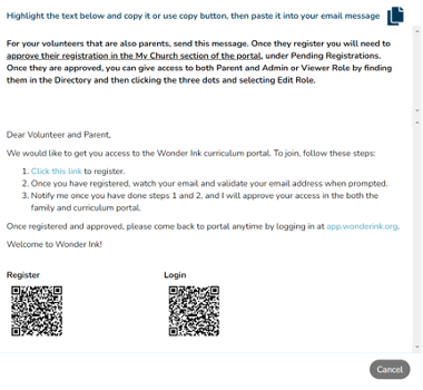 A pop up will appear that has copy for an email as well as a Registration QR code.